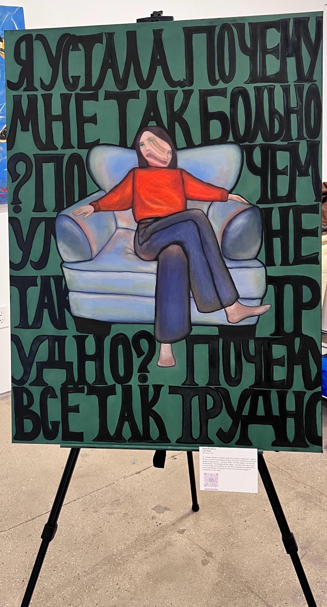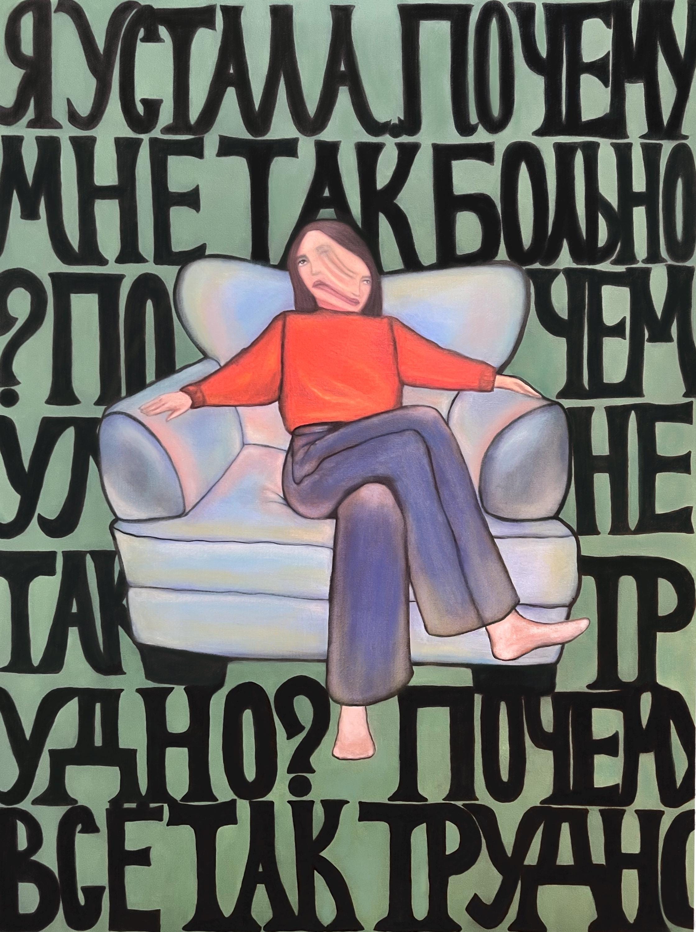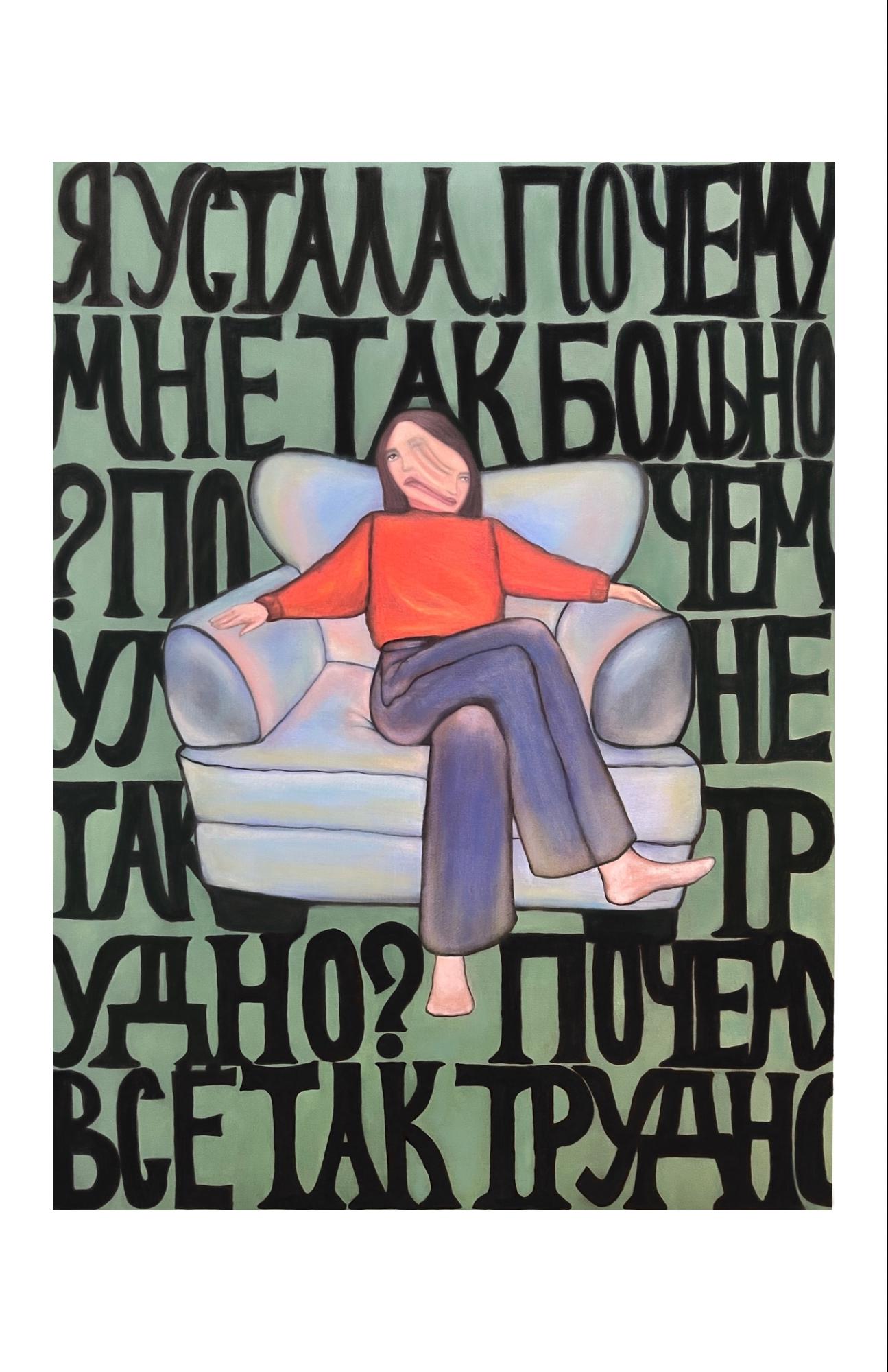 The letters in the background of the painting say: “I am tired. Why does it hurt so much? Why is it so difficult for me? Why is everything so difficult?” These questions reflect the internal struggle I face every day.